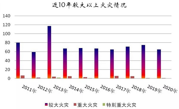 從火災(zāi)的等級看,全年共發(fā)生較大火災(zāi)65起,比上年減少10起、下降13.3%,也是近八年來較大火災(zāi)起數(shù)最少的一年;發(fā)生重大火災(zāi)1起,與上年持平,連續(xù)第二年將重大火災(zāi)起數(shù)控制在單起,是建國以來較少的年份之一;未發(fā)生特別重大火災(zāi),連續(xù)五年未發(fā)生群死群傷惡性火災(zāi)事故。